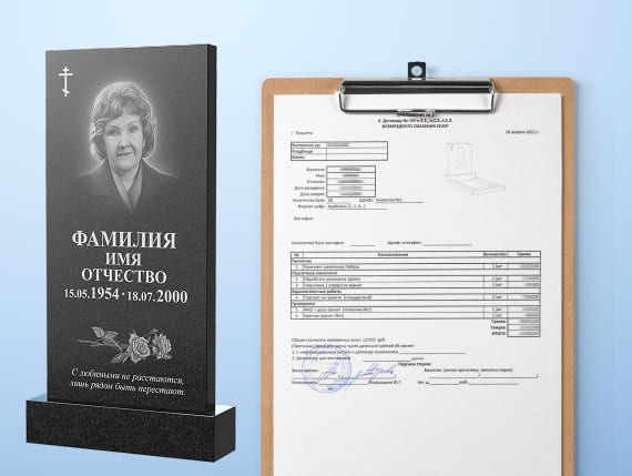 В договор вносятся данные заказчика и умершего. В приложении подробно описываются все элементы заказа, его общая стоимость и сроки выполнения. Заказчик вносит 50% аванса, после чего мы высылаем ретушированный макет для согласования. Приступаем к изготовлению памятника.